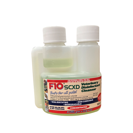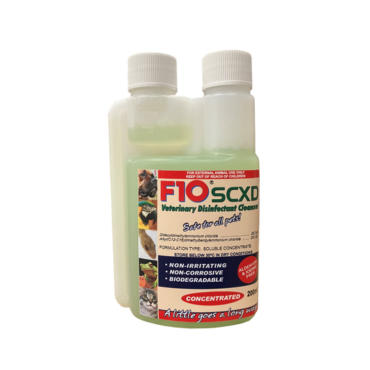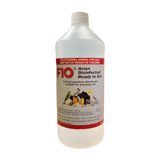 The F10® Disinfectant Range is widely recognised as being the most effective means to keep you, and the animals in your care, safe from disease. The F10® range is proven effective against all known types of pathogen, and in the control of parasitic protozoal diseases such as cryptosporidiosis, coccidiosis and giardiasis by eliminating the oocysts in the environment. At working dilutions it is non-toxic, non-irritant and non-corrosive so is safe for use with your birds and animals and will not damage you, your pets or your equipment.