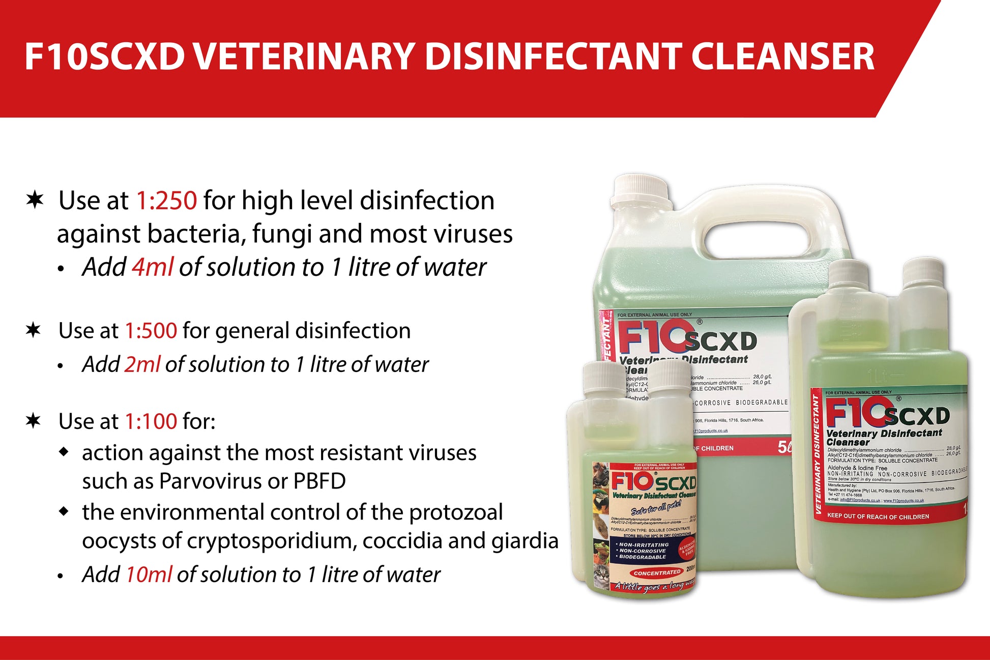 - Due to the cleaning detergent contained in F10®SCXD, any food bowls or instruments that are to come in close contact with animals should be washed with clean water to ensure no soap residue is left.